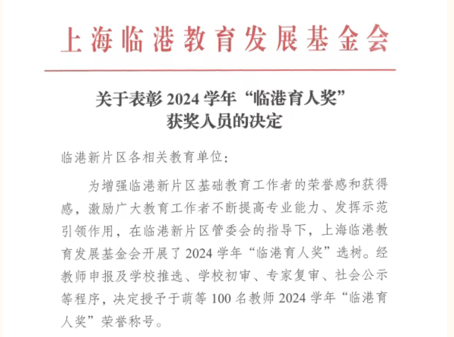 关于表彰2024学年“临港育人奖”获奖人员的决定。