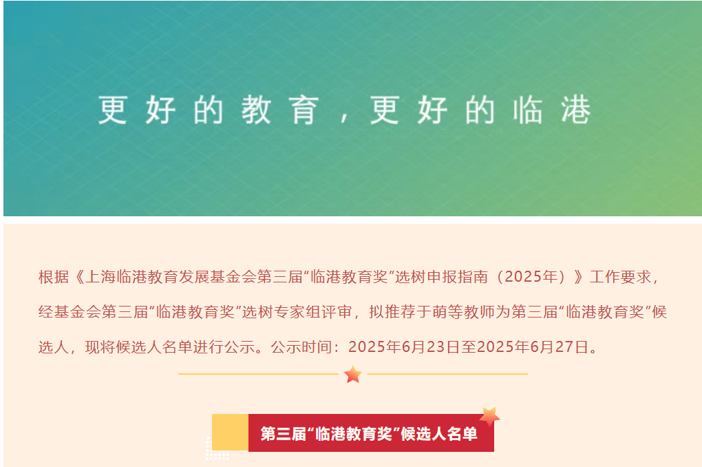 经基金会第三届“临港教育奖”选树专家组评审,拟推荐于萌等教师为第三届“临港教育奖”候选人,现将候选人名单进行公示。