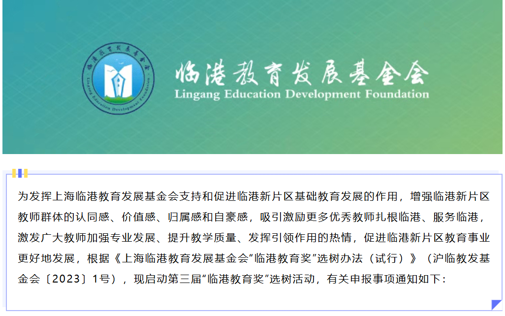根据《上海临港教育发展基金会“临港教育奖”选树办法(试行)》(沪临教发基金会〔2023〕1号),现启动第三届“临港教育奖”选树活动