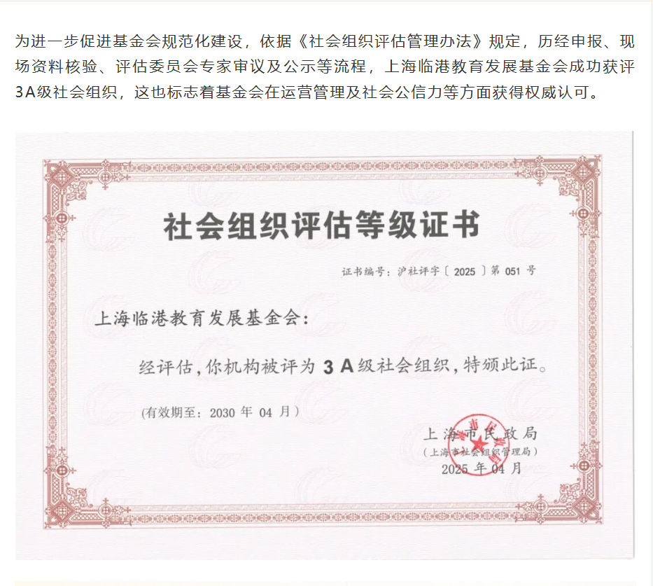 依据《社会组织评估管理办法》规定,历经申报、现场资料核验、评估委员会专家审议及公示等流程,上海临港教育发展基金会成功获评3A级社会组织。