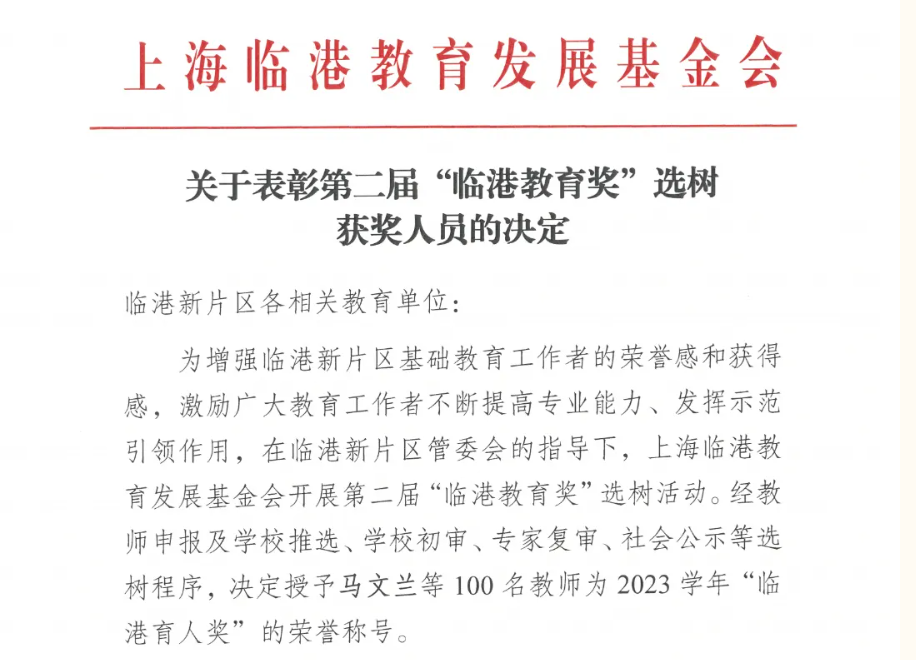 【表彰决定】关于第二届“临港教育奖”选树获奖人员的决定