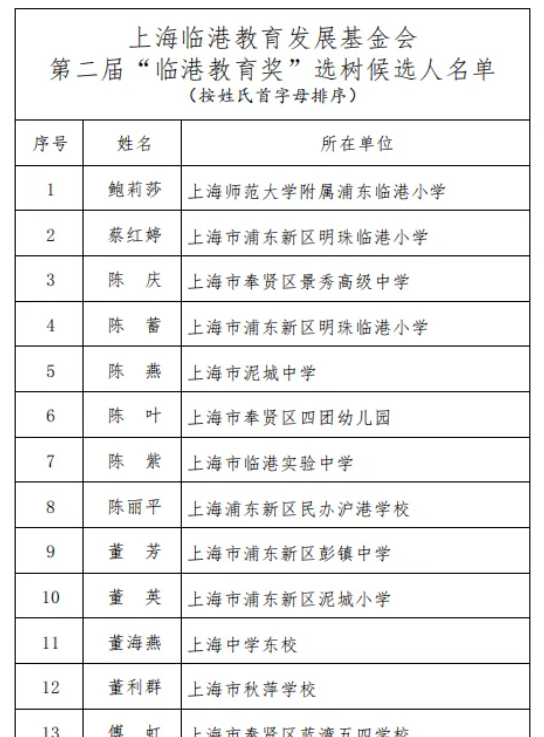 【公示】上海临港教育发展基金会第二届“临港教育奖”选树候选人名单公示
